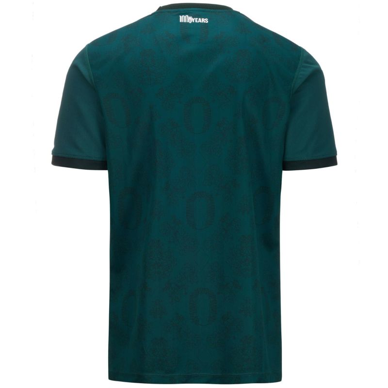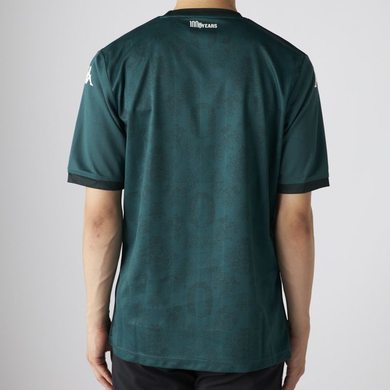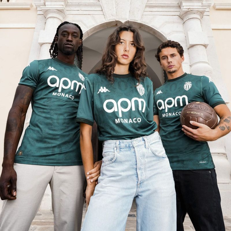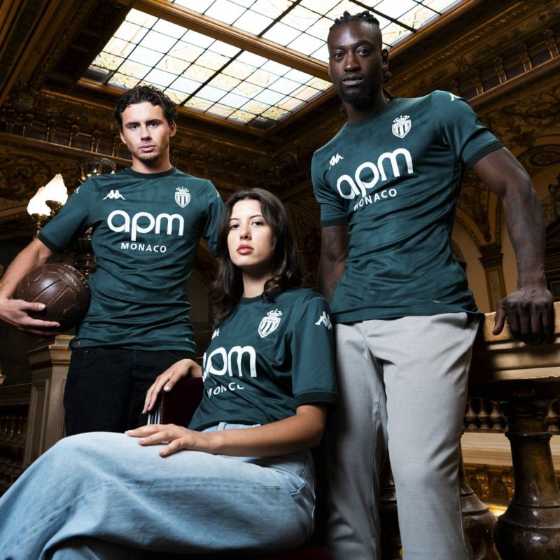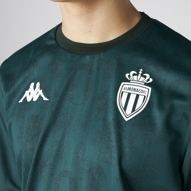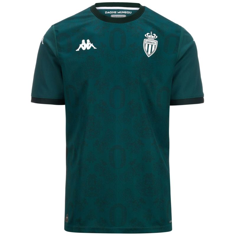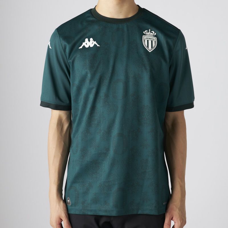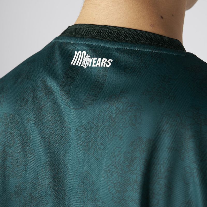 創立100周年のアウェイモデルはホームスタジアム「スタッド・ルイ・ドゥ」の航空写真と、大公宮殿の玉座の間にあるタペストリーの絵を表す柄をグリマルディ家の紋章を思わす菱形でつないで柄にしている。
