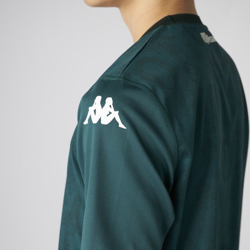 胸に熱転写によるオミニロゴ、前身頃と後身頃パネルにサンライメイトグラフィック、胸にシリコン製チームロゴ、襟の内側と背中に熱転写によるチームレタリング。