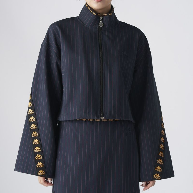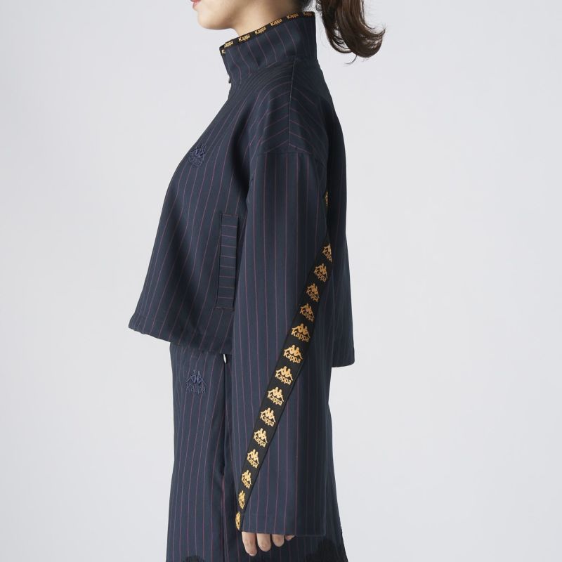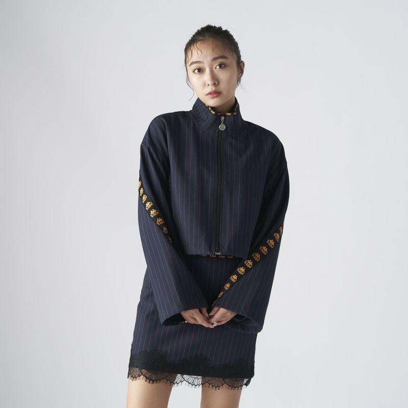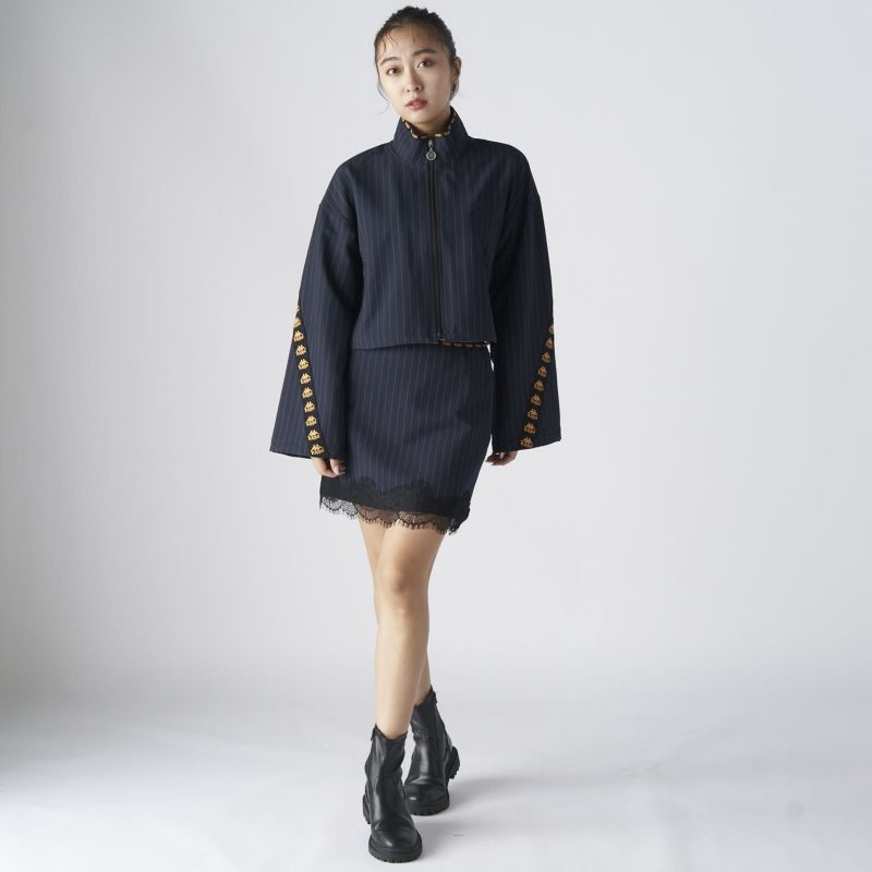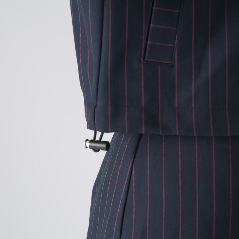 先染めのピンストライプデザインでクラシカルな印象を与えつつ、トレンドのシルエットでエッジを利かせました。