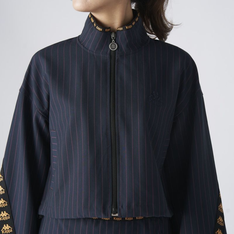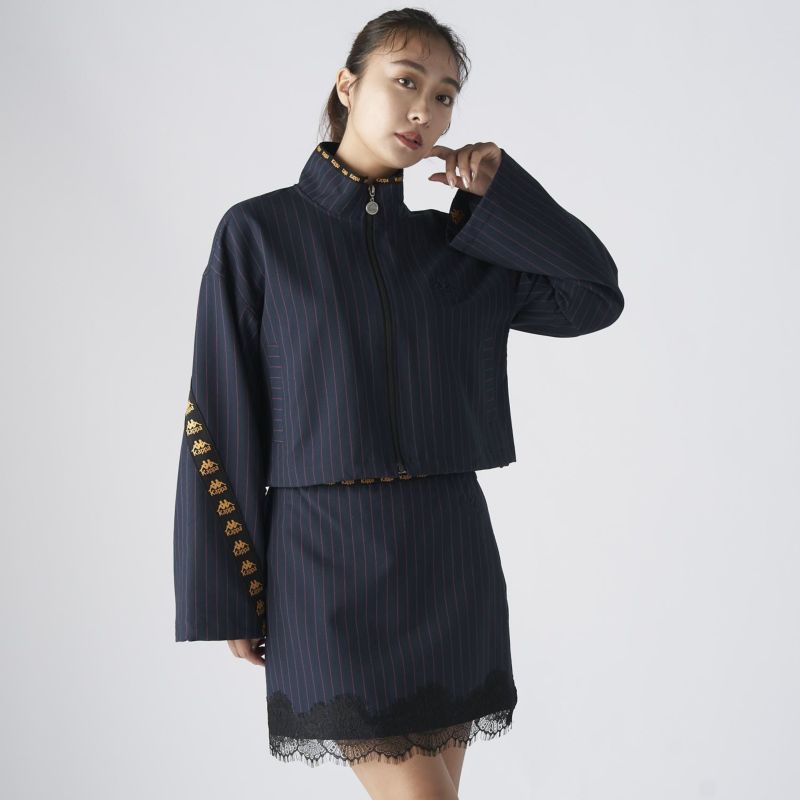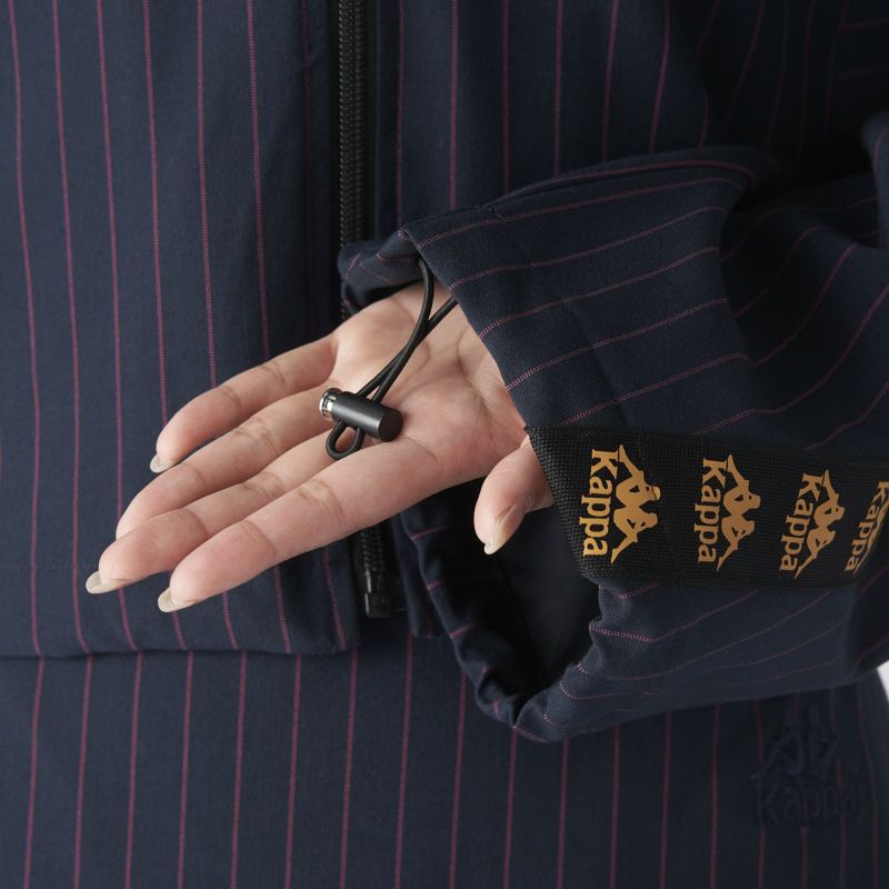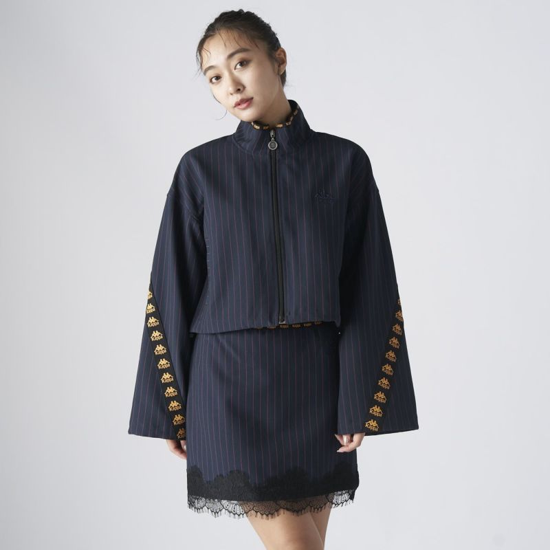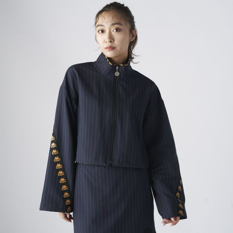 先染めのピンストライプデザインでクラシカルな印象を与えつつ、トレンドのシルエットでエッジを利かせました。