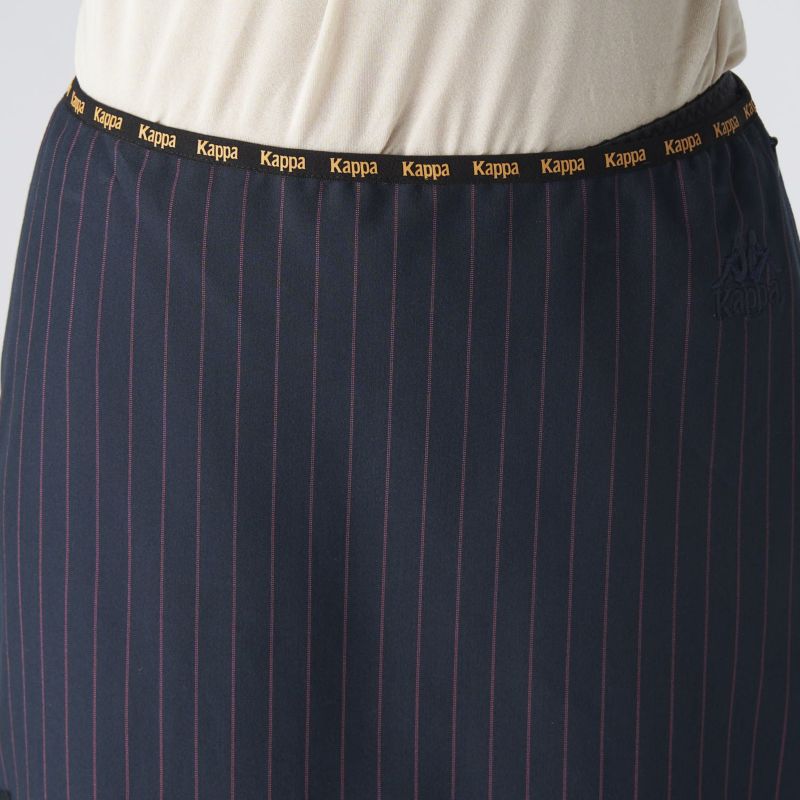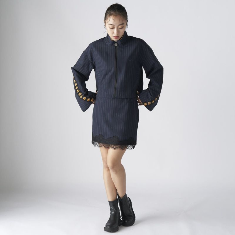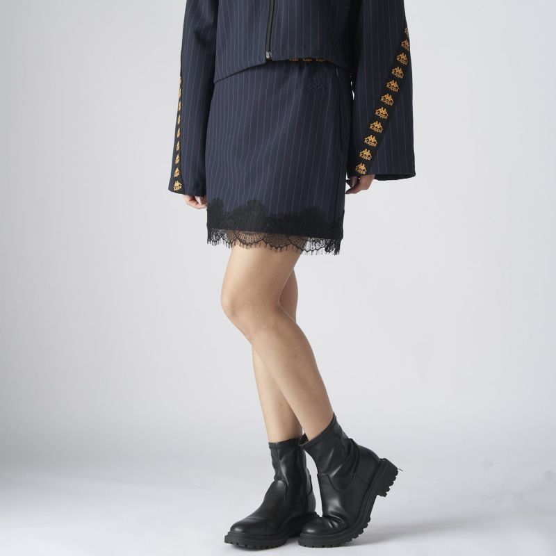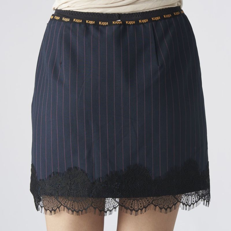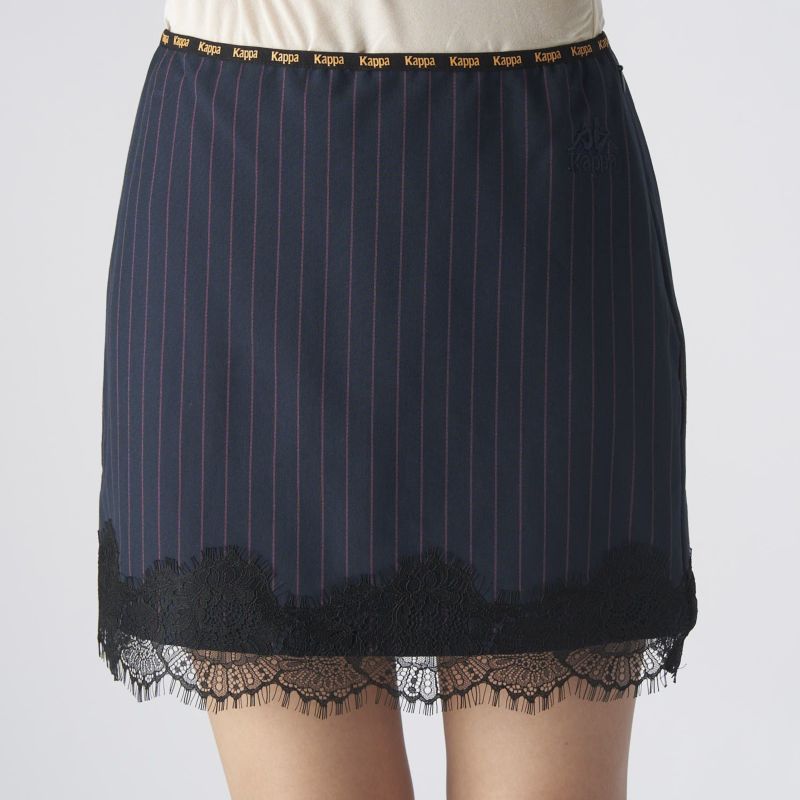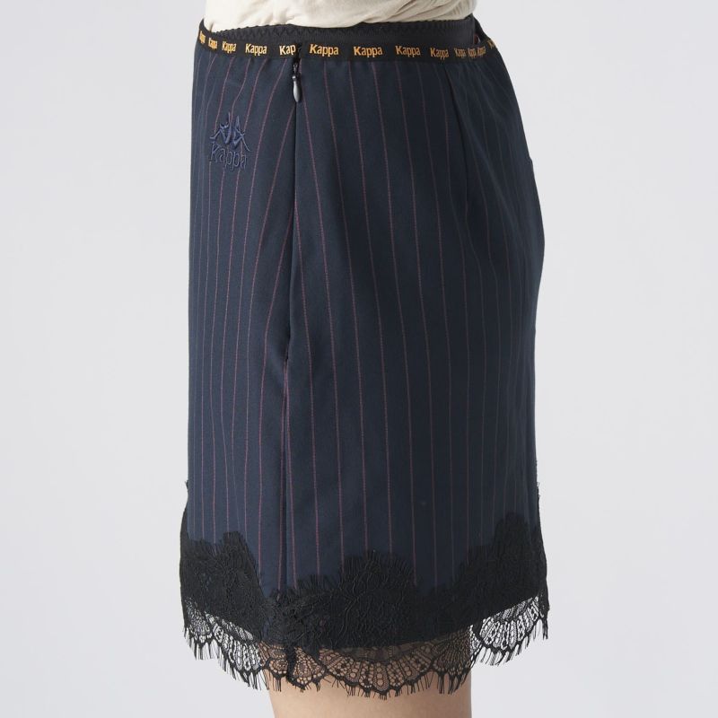 先染めのピンストライプデザインでクラシカルな印象を与えつつ、裾をレースで切り替えたショートスカート。