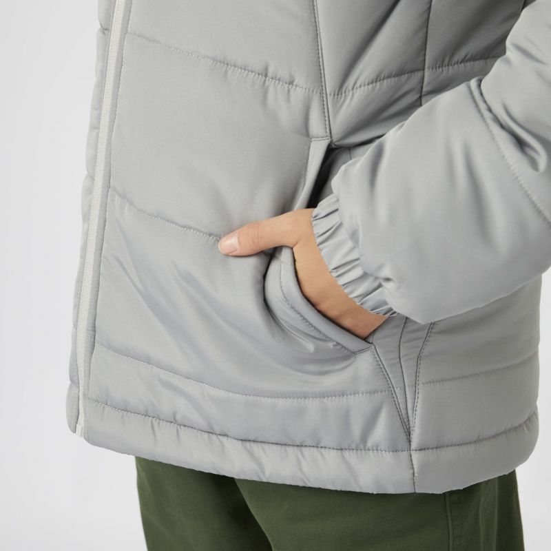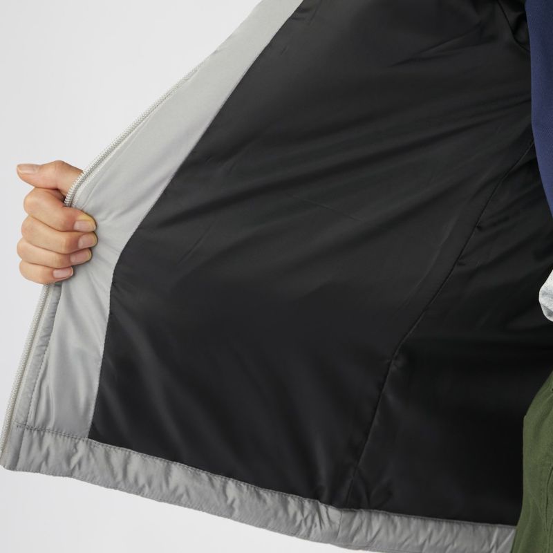 衿が高くフード付きのため首元もしっかり防寒、ほど良いボリュームの中綿ジャケットです。裾はドローコードで調節可能。