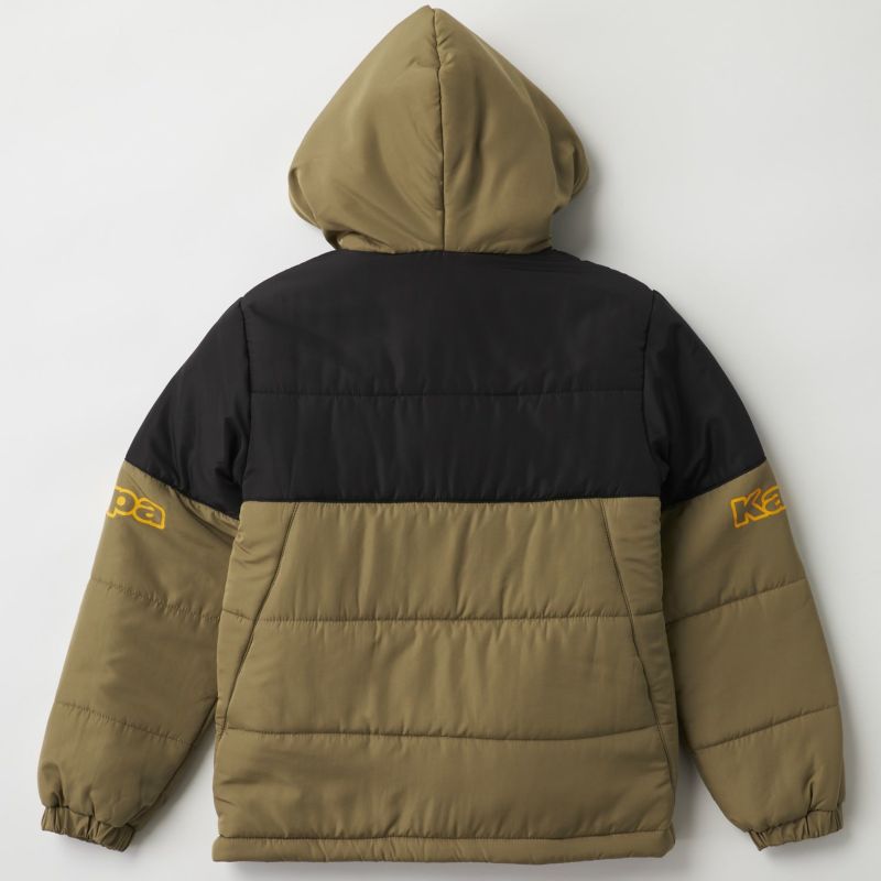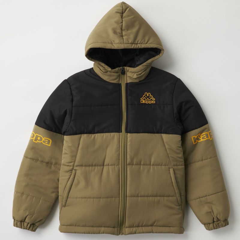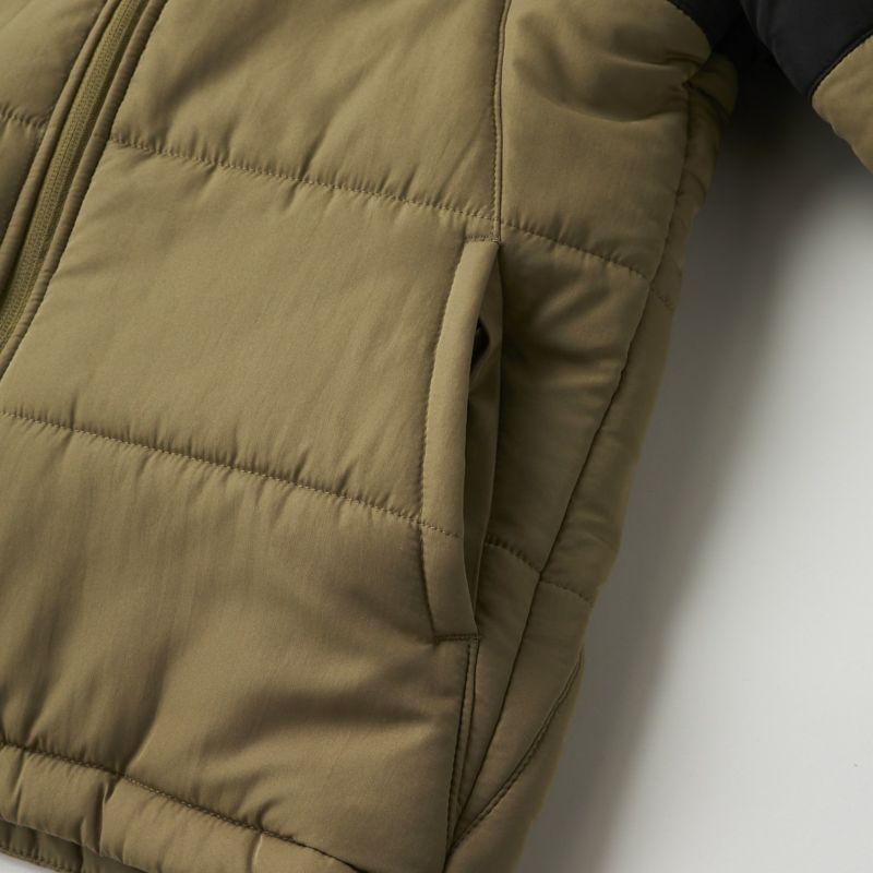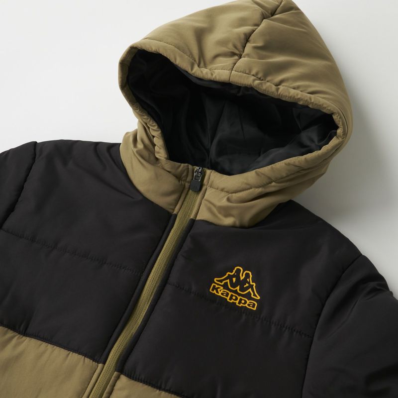 衿が高くフード付きのため首元もしっかり防寒、ほど良いボリュームの中綿ジャケットです。裾はドローコードで調節可能。