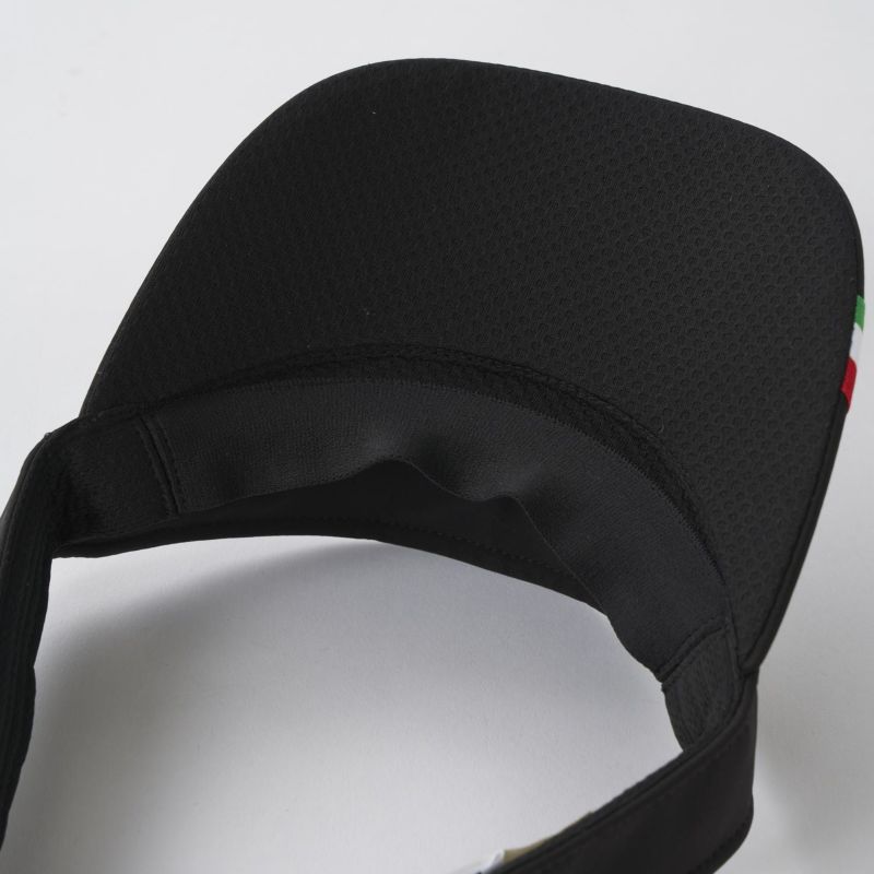 スタンダードなサンバイザーですが、イタリアのトリコカラーがワンポイントのアイテム。着用したときの額部の圧迫、蒸れを防ぐ為、本体との間にベンチレーション搭載。