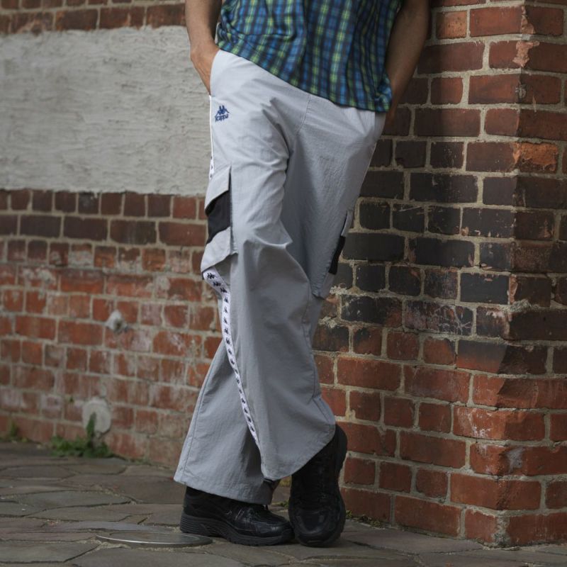 ナイロン素材を採用したカーゴパンツです。裾にかけてフレアシルエットに設計し、裾部分はドローコードで絞る事が可能です。