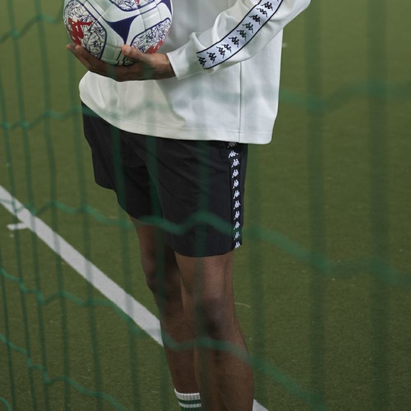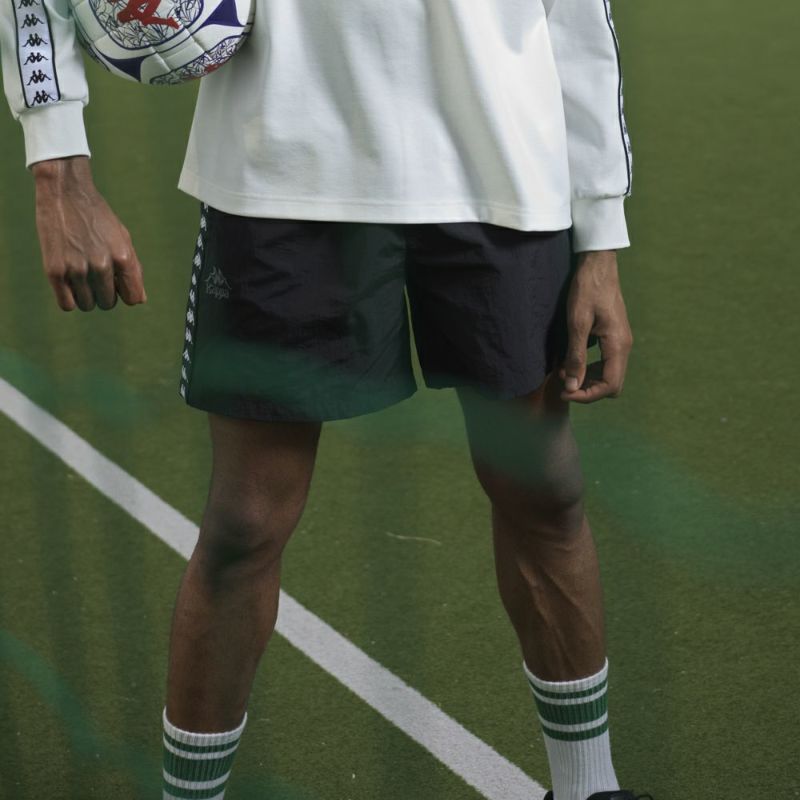 ナイロン素材を採用したハーフパンツです。テープデザインがデザインポイントになっています。