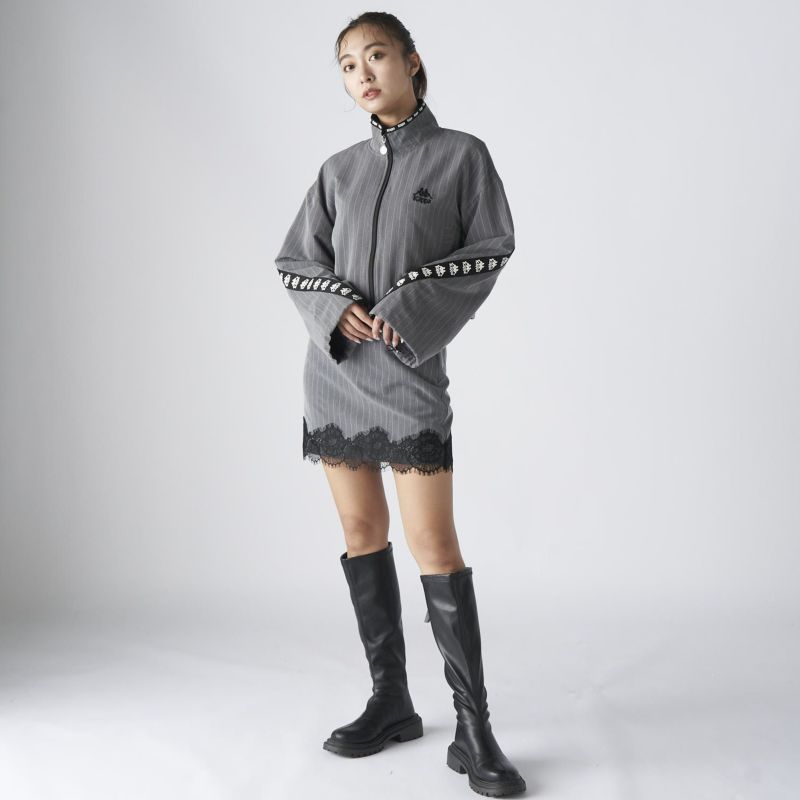 先染めのピンストライプデザインでクラシカルな印象を与えつつ、トレンドのシルエットでエッジを利かせました。