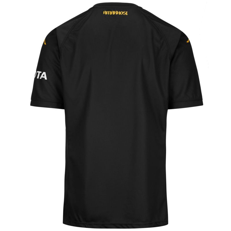 インターロック生地を使用し、HYDRO-WAY PROTECTIONテクノロジーを搭載した、KOMBAT? 2025 メンズゲームシャツ。レギュラーフィットのシルエットで、ジャカードリブ仕様の半袖Vネックデザインです。フロント、バック、袖にはジャカード生地を使用し、胸元と袖には熱転写によるOminiロゴとスポンサーロゴを配置。胸にはシリコン製のチームロゴがあしらわれています。KAIZER CHIEFS FOOTBALL CLUB オフィシャルモデル。