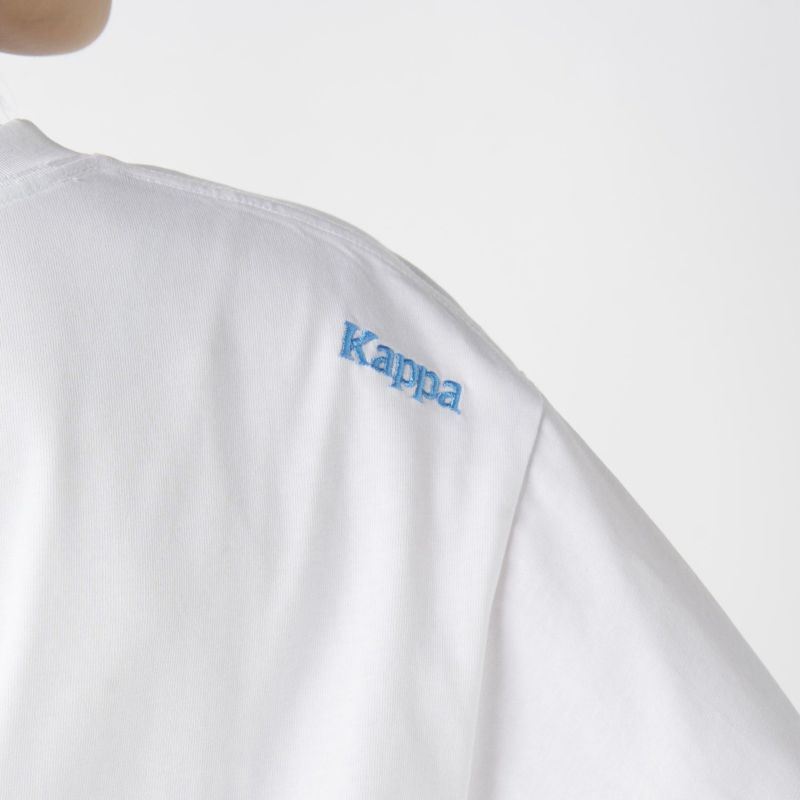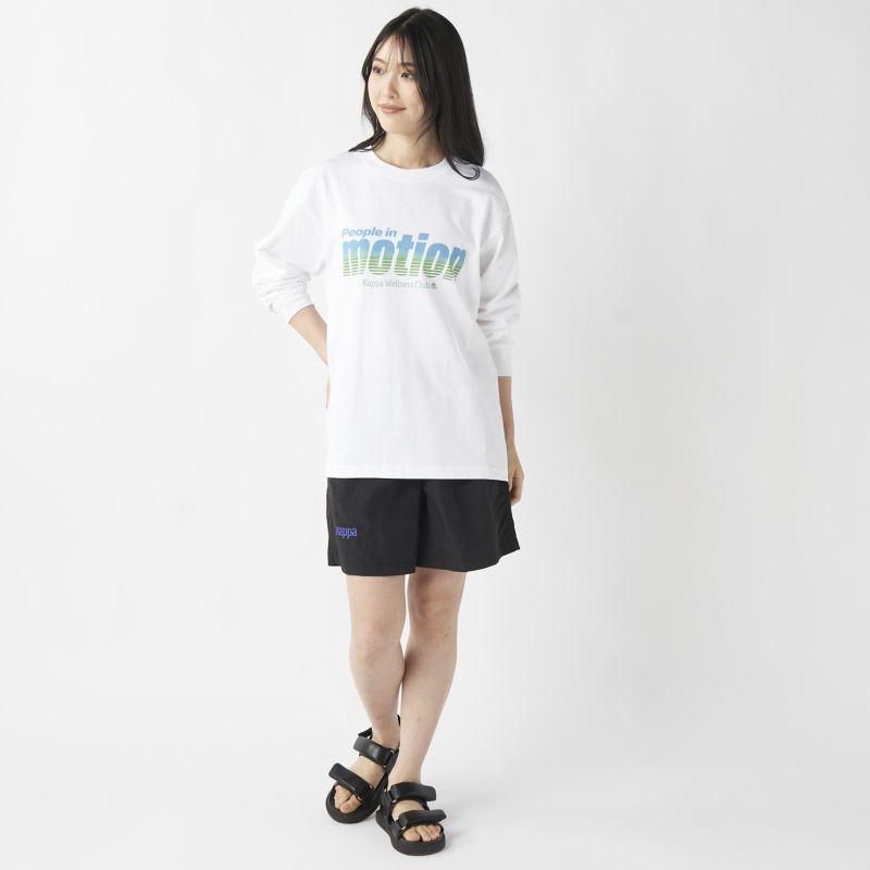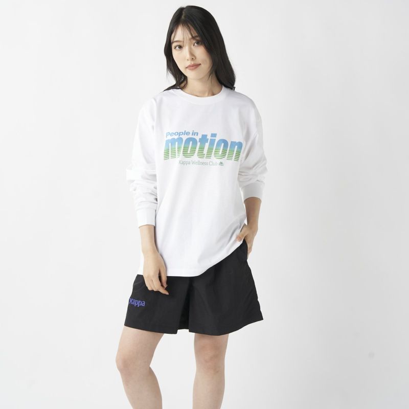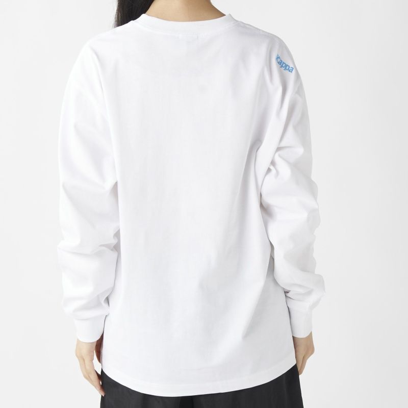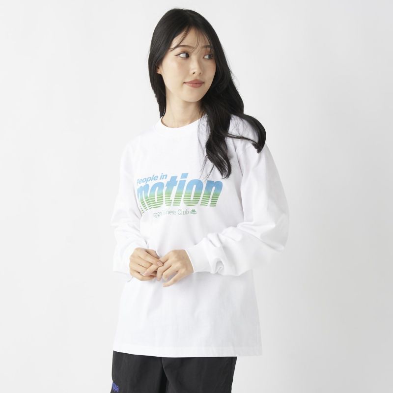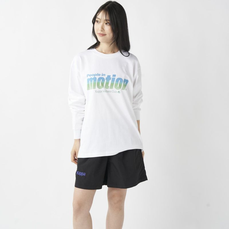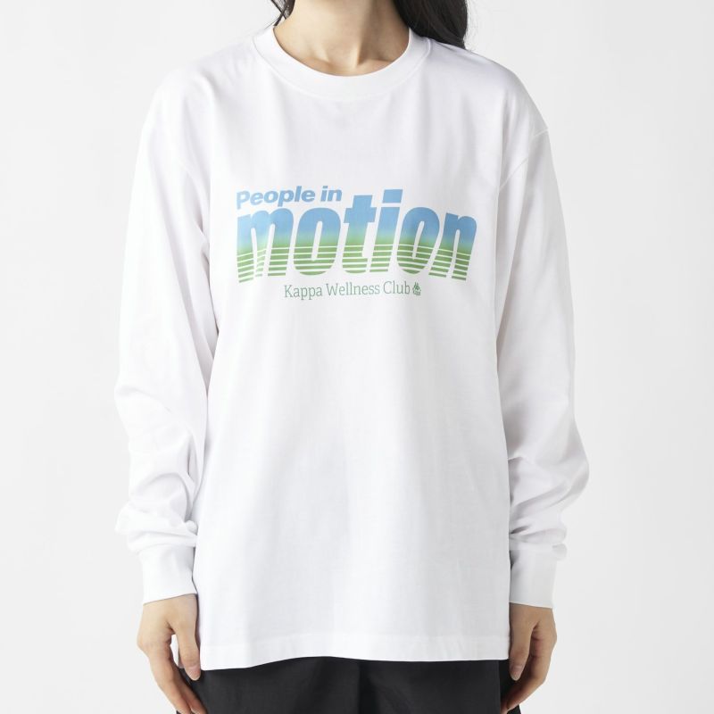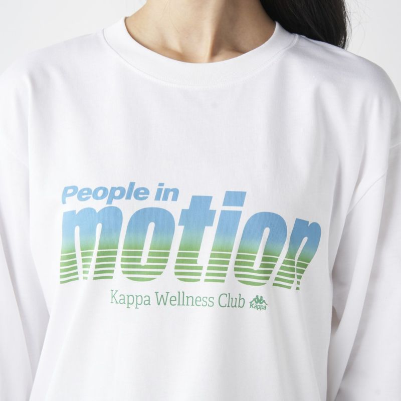 Kappaの文言であるPEOPLEINMOTIONをグラデーションを使ったグラフィックで落とし込んだデザイン。Kappaのブランドロゴはコレクション通して象徴的に後ろ右肩に刺繍で配しております。