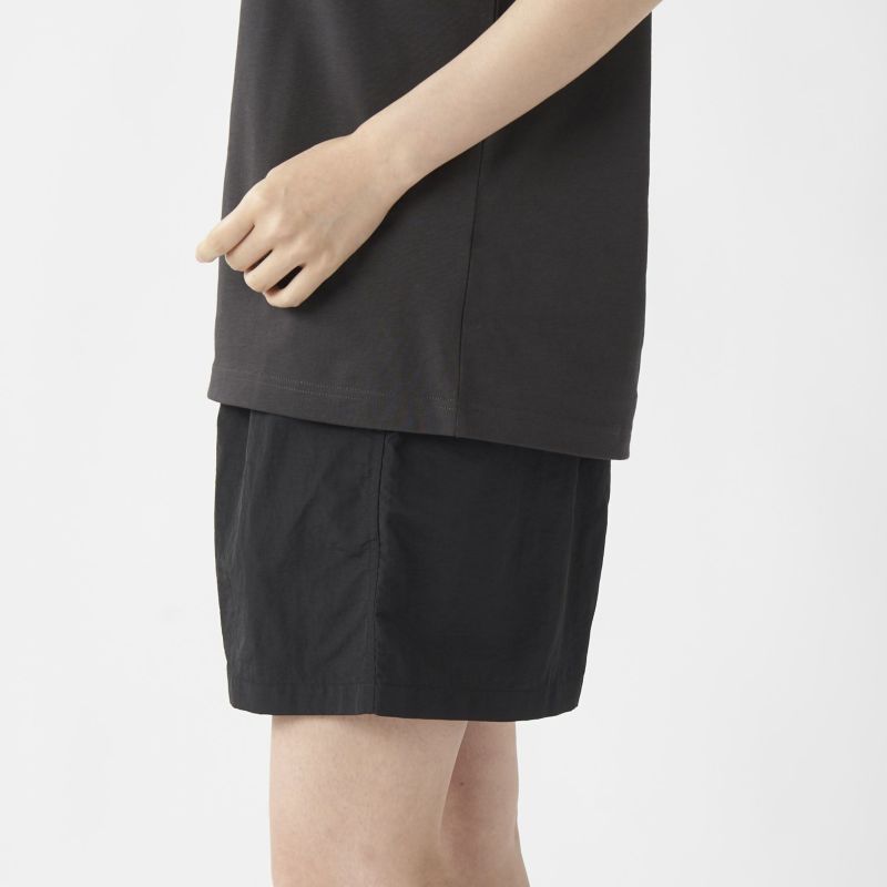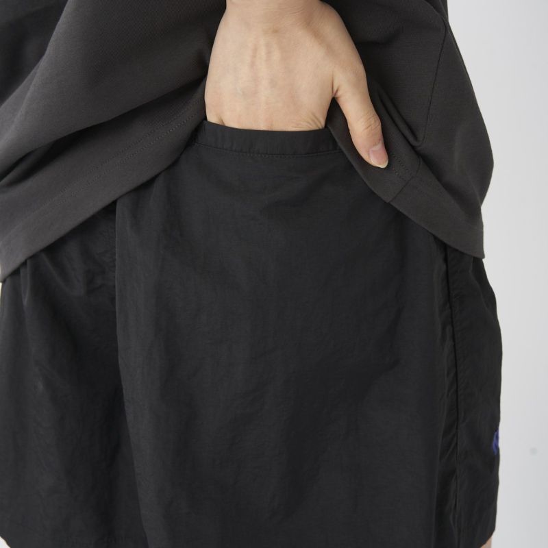 裏地は100%ポリエステルのメッシュインナー付き。ゆったりしたシルエットにゴムウエストというイージー仕様の水陸両用ショートパンツ。ウエストゴムはフロントにアタッチメントとアジャスターが付いており必要に応じて調整が可能です。両サイドのスリットポケット、ジップ付きのバックポケットを完備。