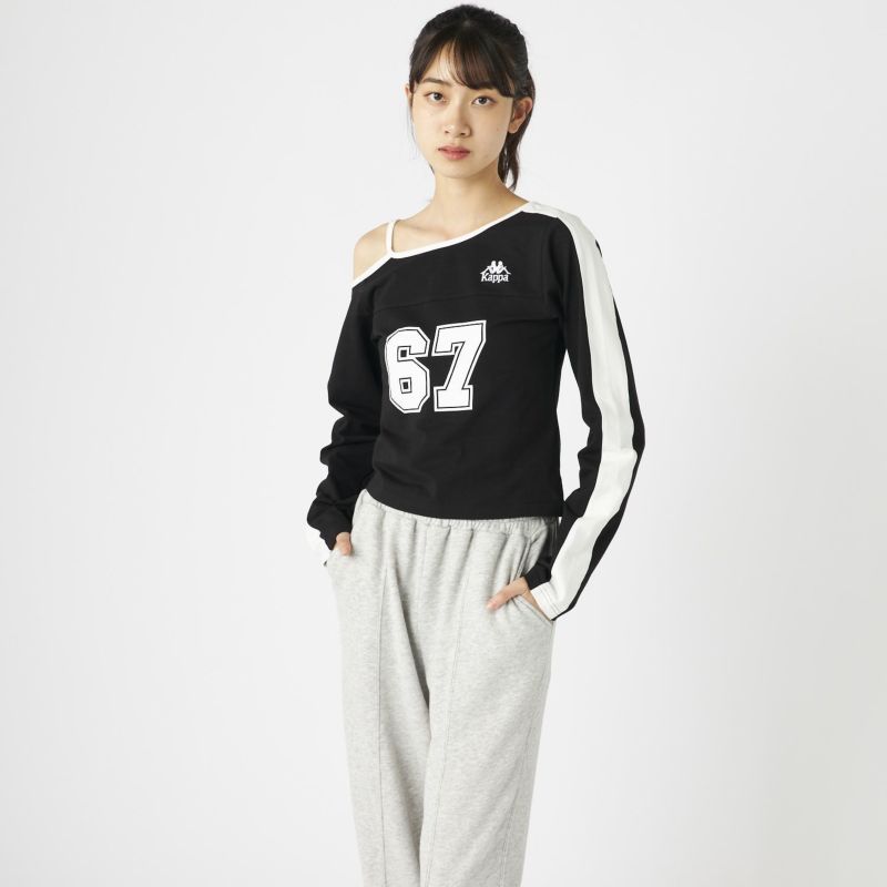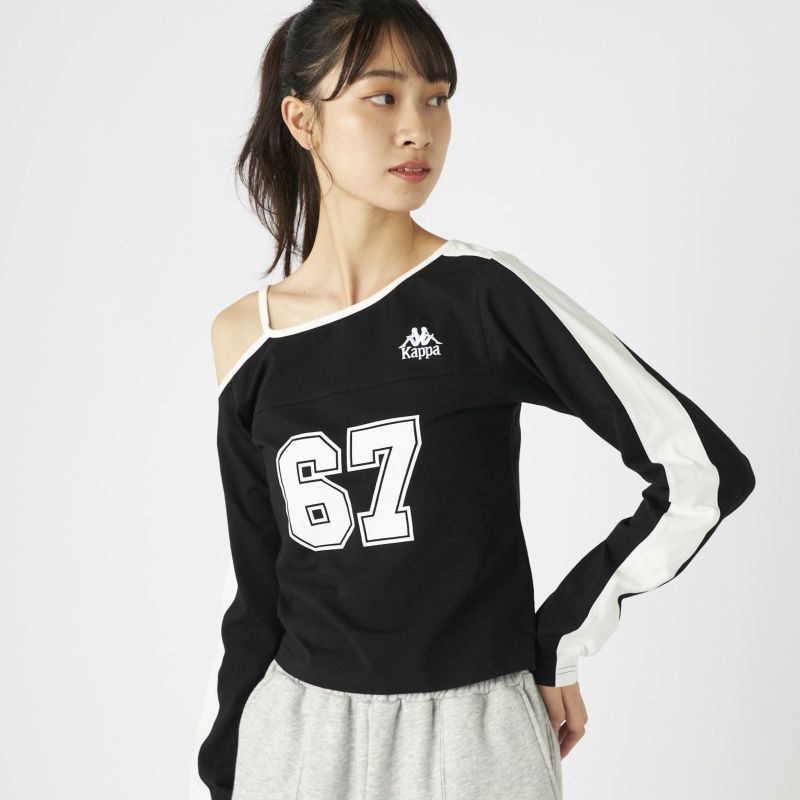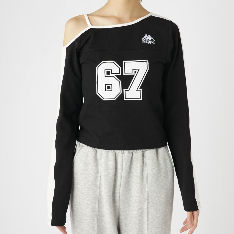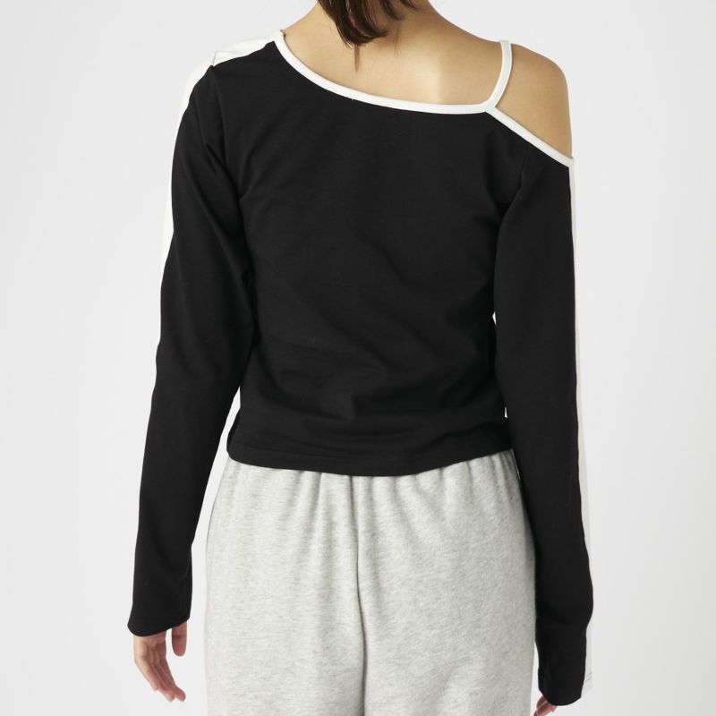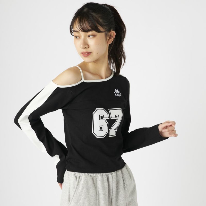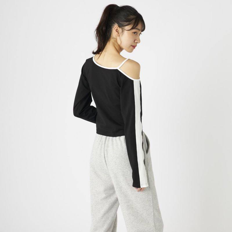 肩にストラップがついたショート丈の長袖Tシャツです。