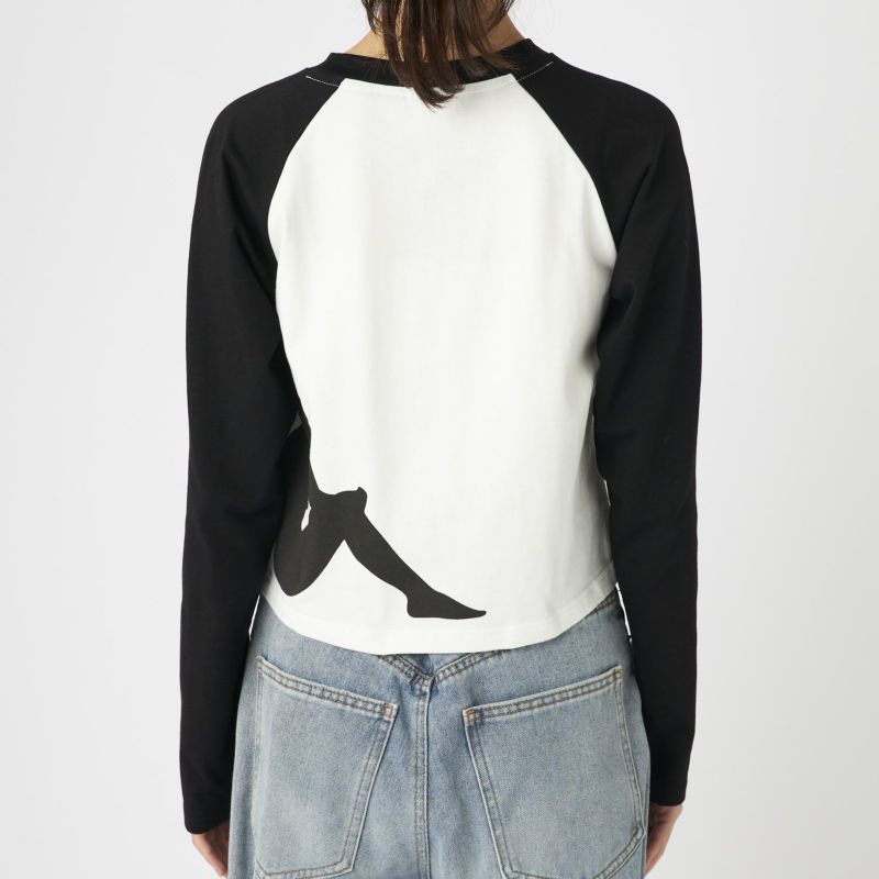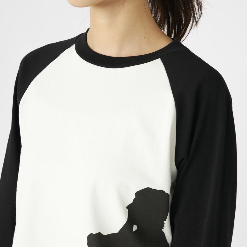 大きな前後にわたるシルエットロゴがポイントのラグランTシャツです。