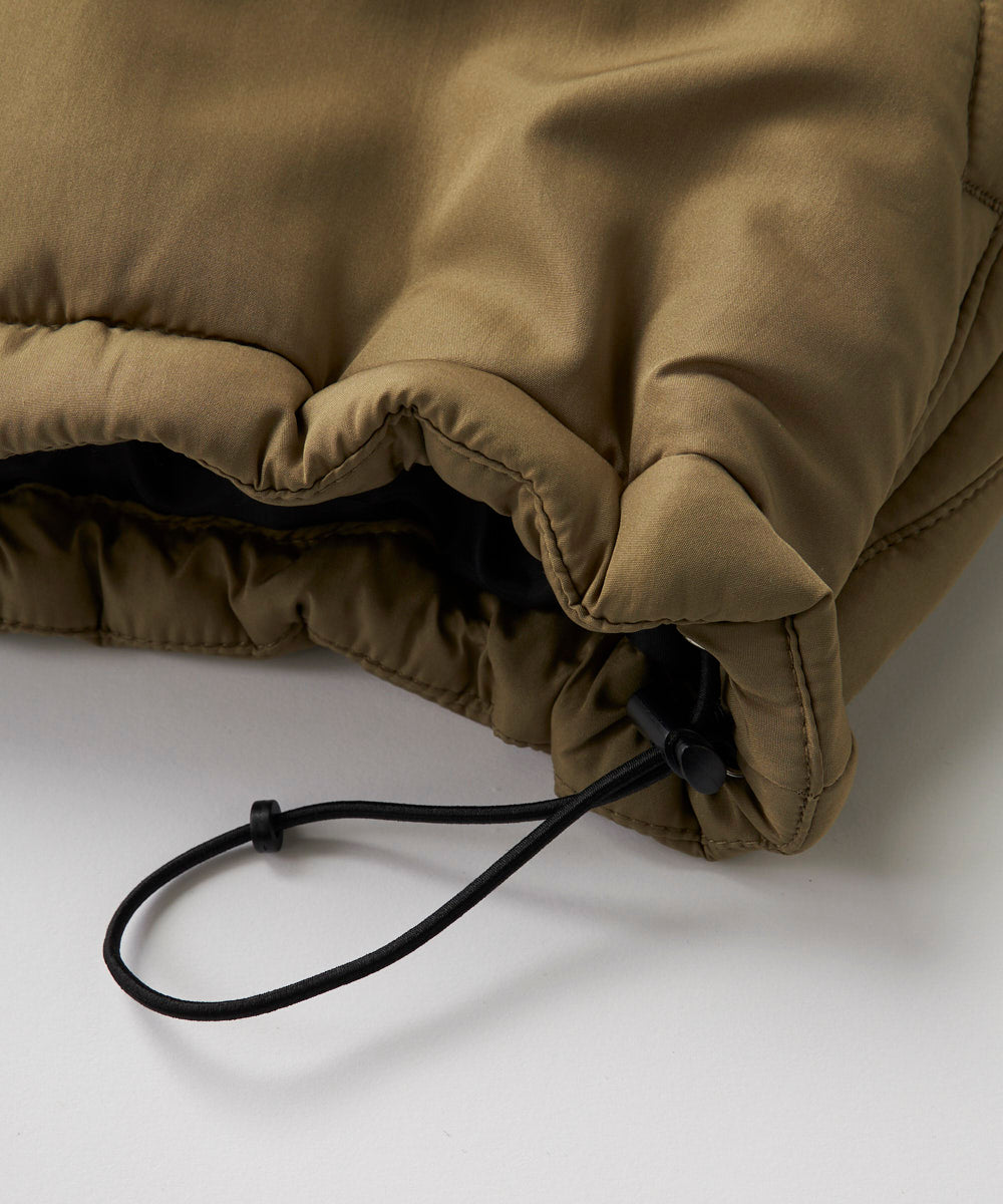 衿が高くフード付きのため首元もしっかり防寒、ほど良いボリュームの中綿ジャケットです。裾はドローコードで調節可能。
