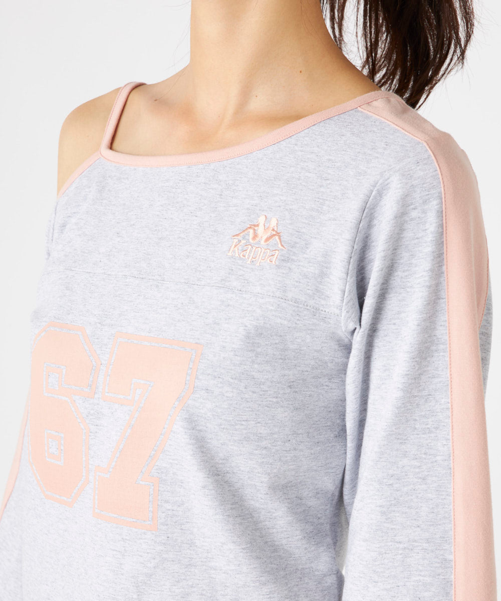 肩にストラップがついたショート丈の長袖Tシャツです。
