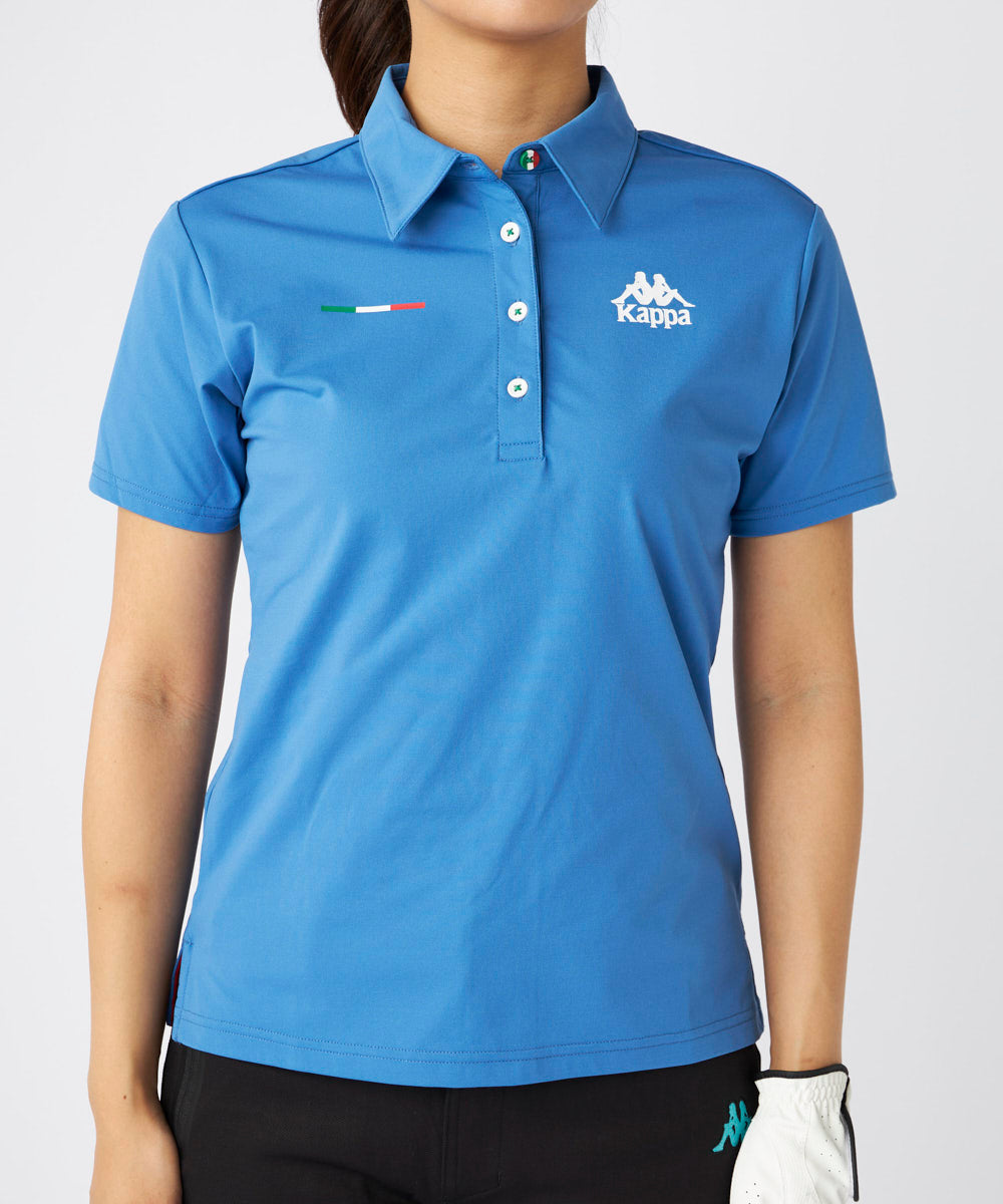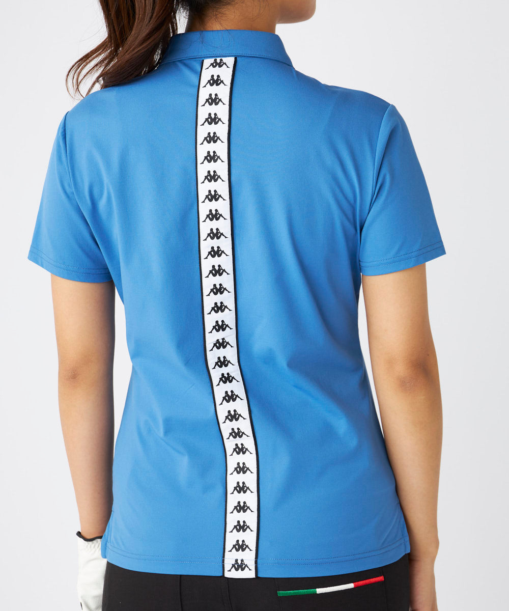 正面はシンプルで背面に大胆なバンダロゴを配置したインパクト抜群のレディスポロシャツです。軽量で吸汗速 乾の生地を使用しており、猛暑のゴルフで快適に着用できるモデルとなっております。