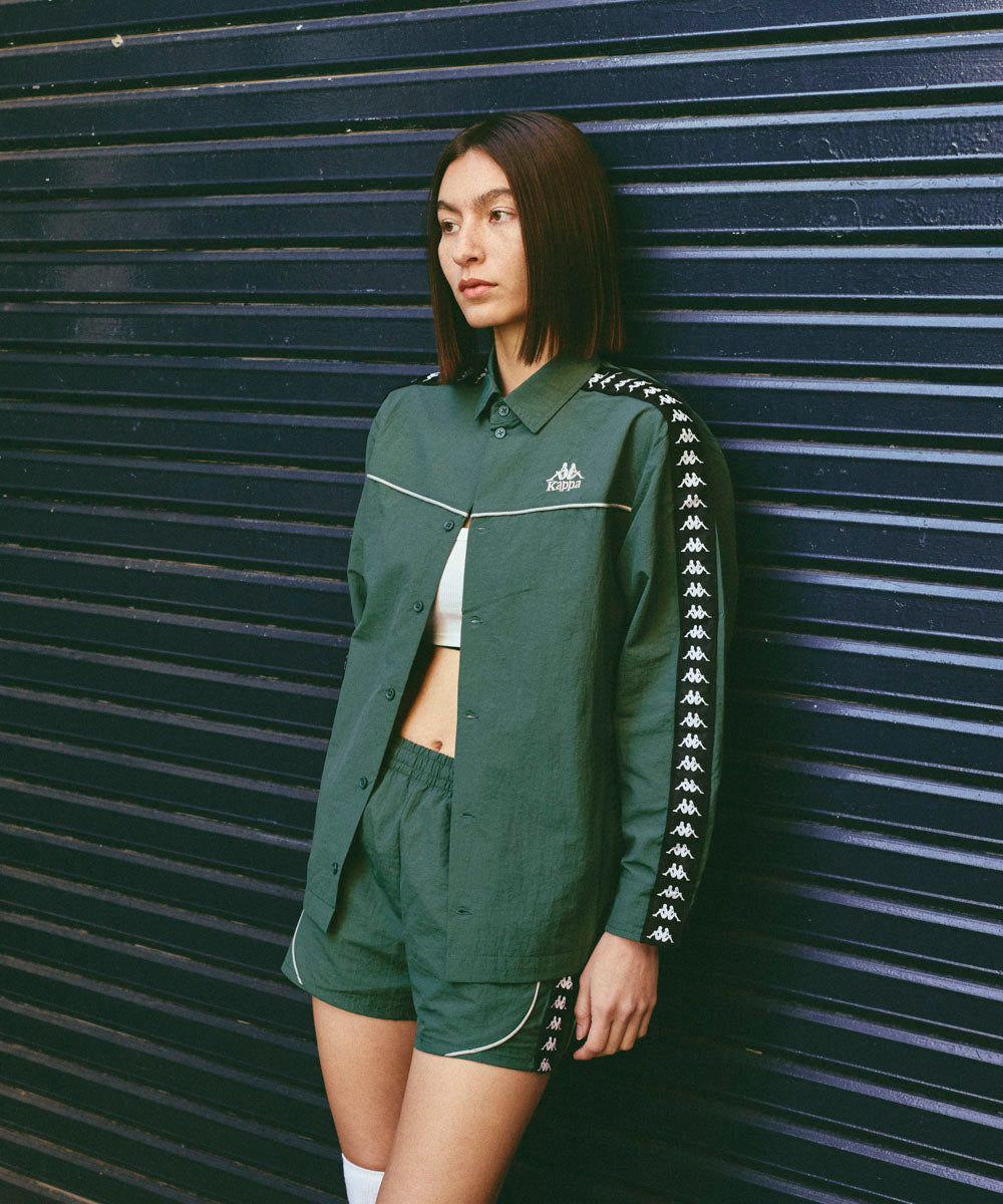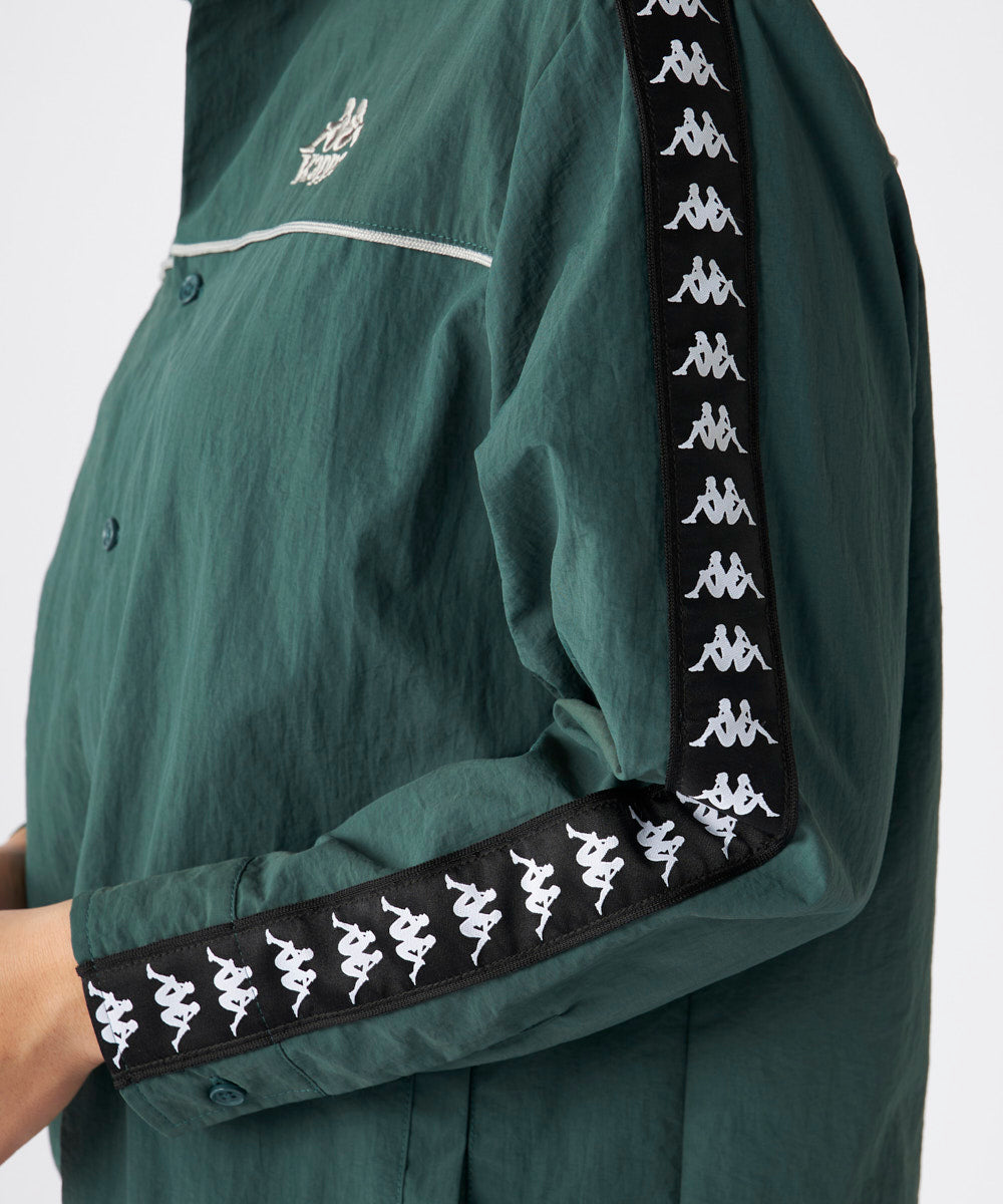ナイロンタッサー素材を採用したテープデザインのワーク風シャツです。スタンダードなシルエットで設計して います。